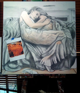 Next on the easel is a commissioned work of a nude, standing in a bath tub... stay tuned for this one! Painted directly onto wood panel with oil paints, rich in burgundy gold and black, it is sure to be a luxurious and decadent piece to grace the walls of its' new home when completed.